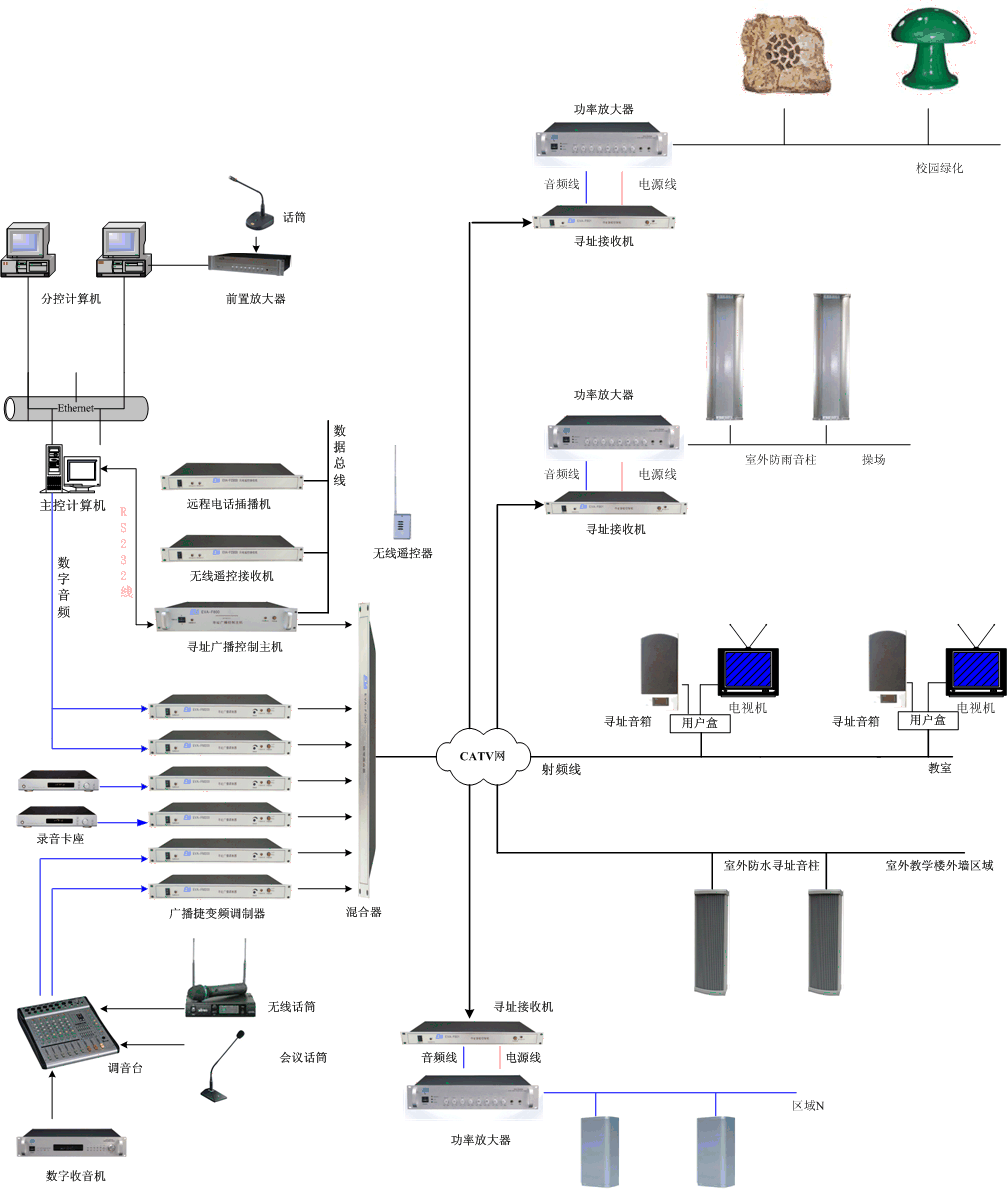 本系統(tǒng)最大的特點(diǎn)就是把現(xiàn)在使用的廣播系統(tǒng)通過(guò)科技論證,采用科學(xué)的手段,把音頻調(diào)制、定壓功放、地址編碼、音頻混合、控制信號(hào)、遠(yuǎn)程遙控、多路輸出等多種功能有效的結(jié)合在一體,通過(guò)一根有線電視線網(wǎng)傳輸?shù)矫恳粋(gè)角落。從而實(shí)現(xiàn)系統(tǒng)只需要一臺(tái)廣播主機(jī)實(shí)現(xiàn)多種廣播任務(wù),無(wú)極限擴(kuò)充,性能更加穩(wěn)定,更加人性化,更有利于產(chǎn)品在各個(gè)領(lǐng)域里的推廣和應(yīng)用。真正實(shí)現(xiàn)了從教室到操場(chǎng)一網(wǎng)到底、多網(wǎng)合一的強(qiáng)大功能。